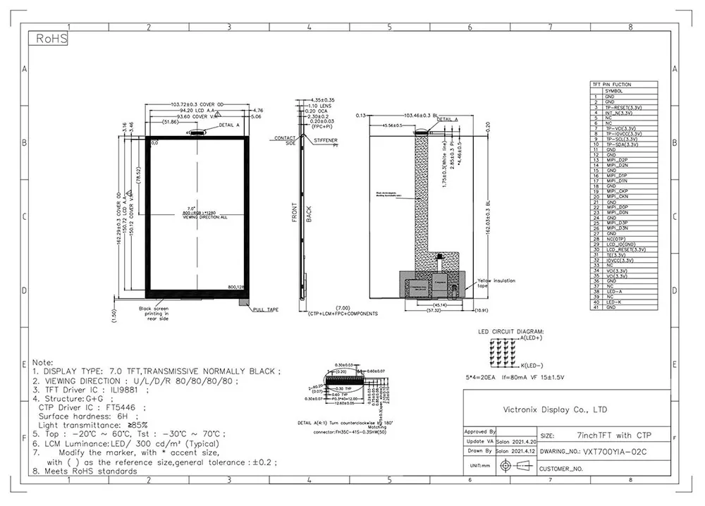 TFT LCD minangka jinis tampilan kristal Cairan sing nggunakake teknologi transistor film-film kanggo nambah kualitas gambar, lan nduweni aplikasi ing saben dinane. Minangka Produsen TFT profesional lan supplier ing China, apa sing nggawe minicerix 7 inci 800 × 1280 mipi ips tft lcd kanthi ctp beda karo manufaktur liyane? Kaping pisanan, nawakake padhange khas 300 CD / M², sudhut pemandangan amba, 80 ° ing kabeh arah, lan kontras rasio 1000: 1, njamin sing apik banget saka macem-macem sudut. Kaping pindho, nggabungake unit lampu mburi nggunakake SS4p-LED kanthi umur khas 20,000 nganti 50.000 jam (kanggo 50% padhang dhisikan), njamin visibilitas padhang ing kabeh kondisi cahya. Kejabi, ndhukung antarmuka Mipi karo Ili9881 lan Panel Tutul Capacitive nganggo Controller FT5446. Kajaba iku, tes tes lingkungan sing ketat, kalebu kejut termal (30 ° C ↔ + 80 ° C °), panyimpenan asor (bisa uga bisa digunakake kanthi lancar (-20 ° CATE TO + 60 ° C).